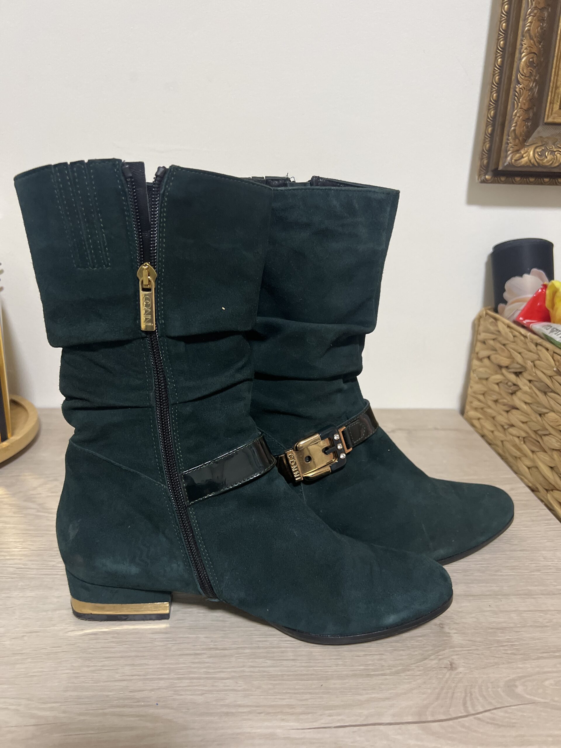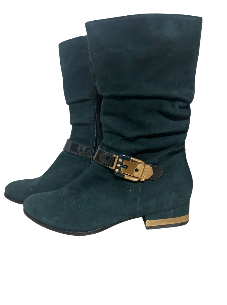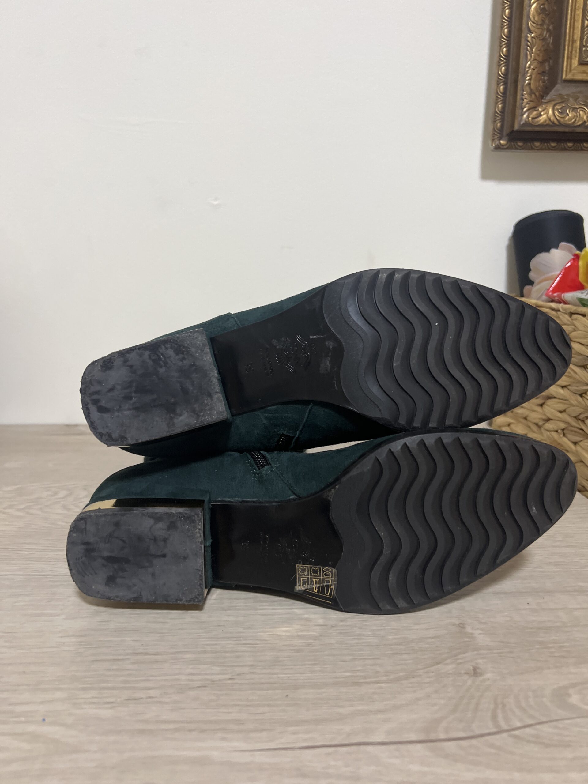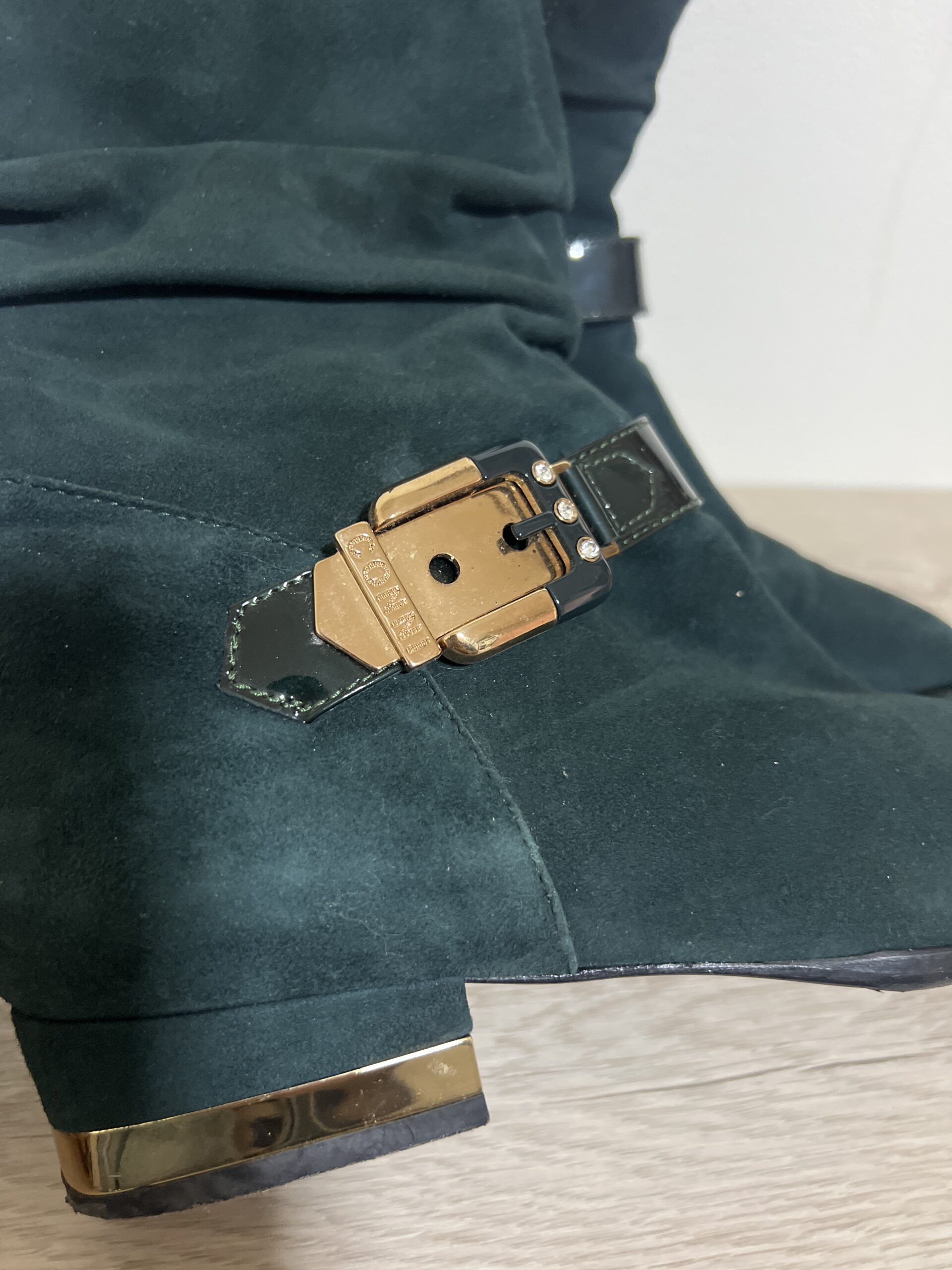 מגפון מהמם בצבע ירוק בקבוק עם עקב נמוך ,ו אבזם זהב על הצד יתאים לרגל צרה