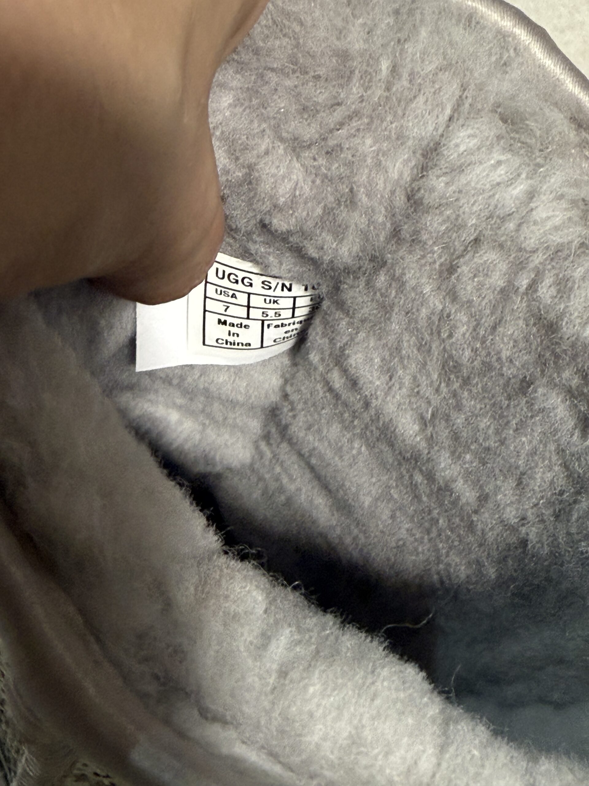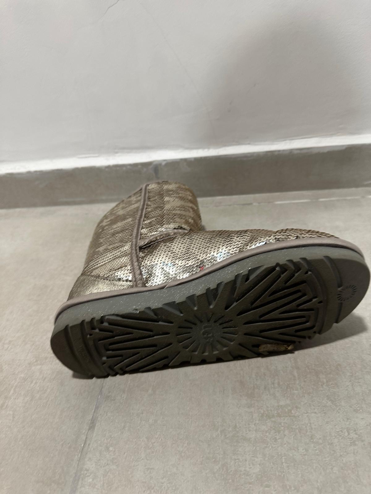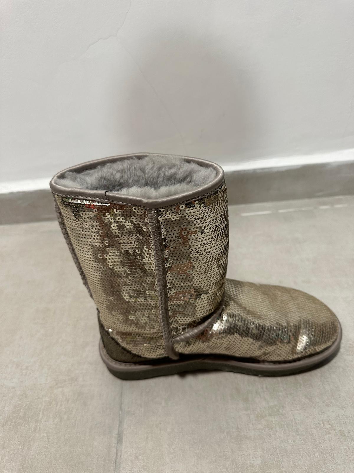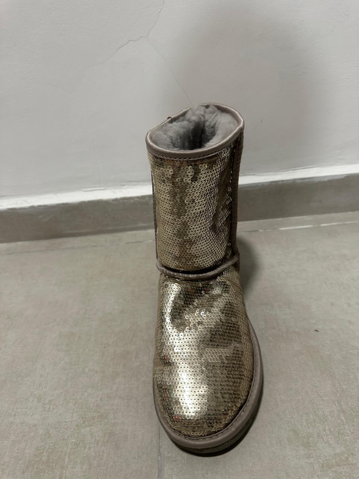 דגם קלאסי של UGG, מכוסה פייטים בצבע כסף. נלבש פעמיים-שלוש ולצערי נמכר עקב שינוי במידת הרגליים אחרי הלידה.