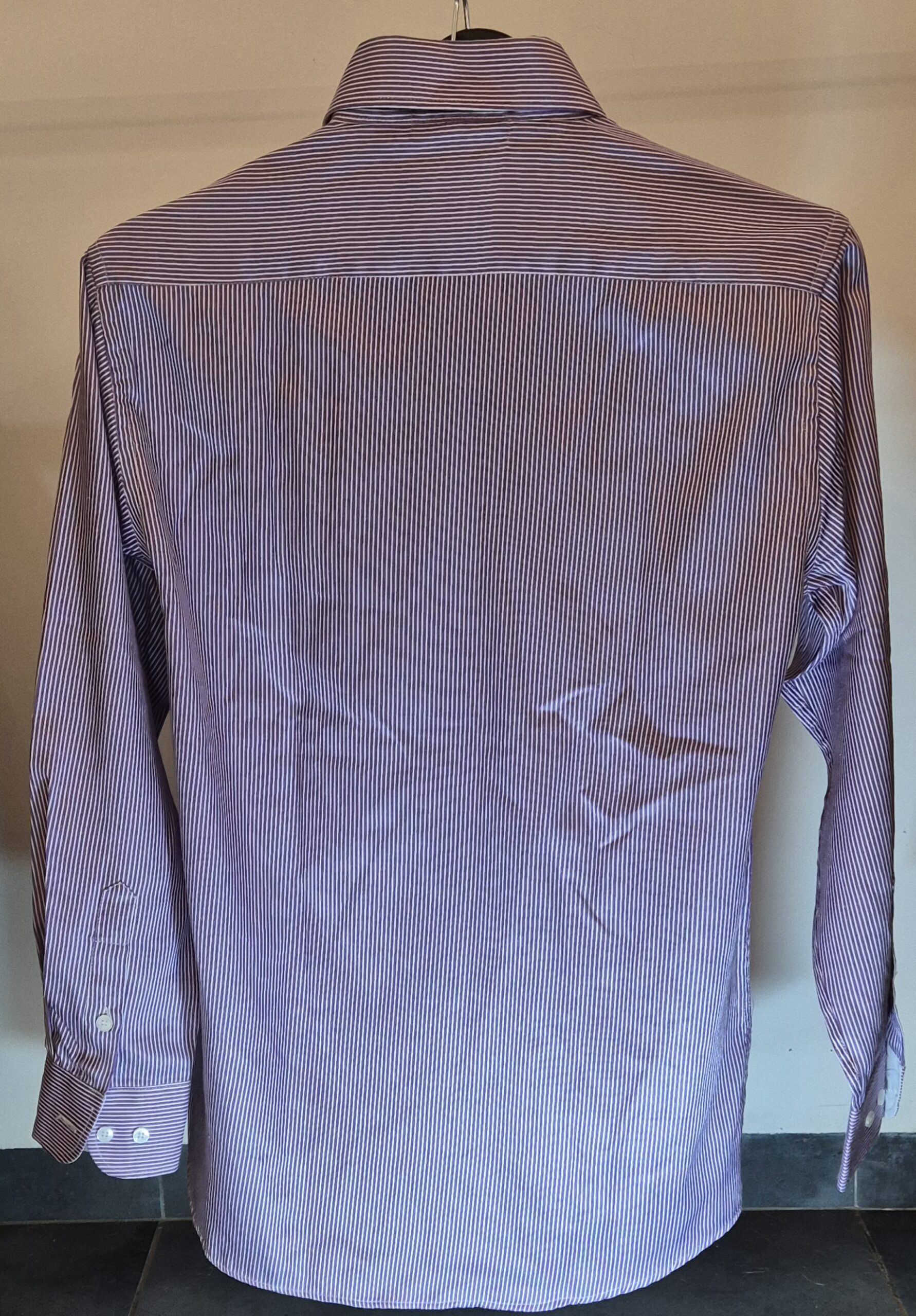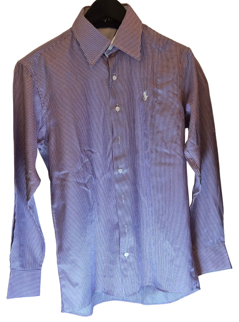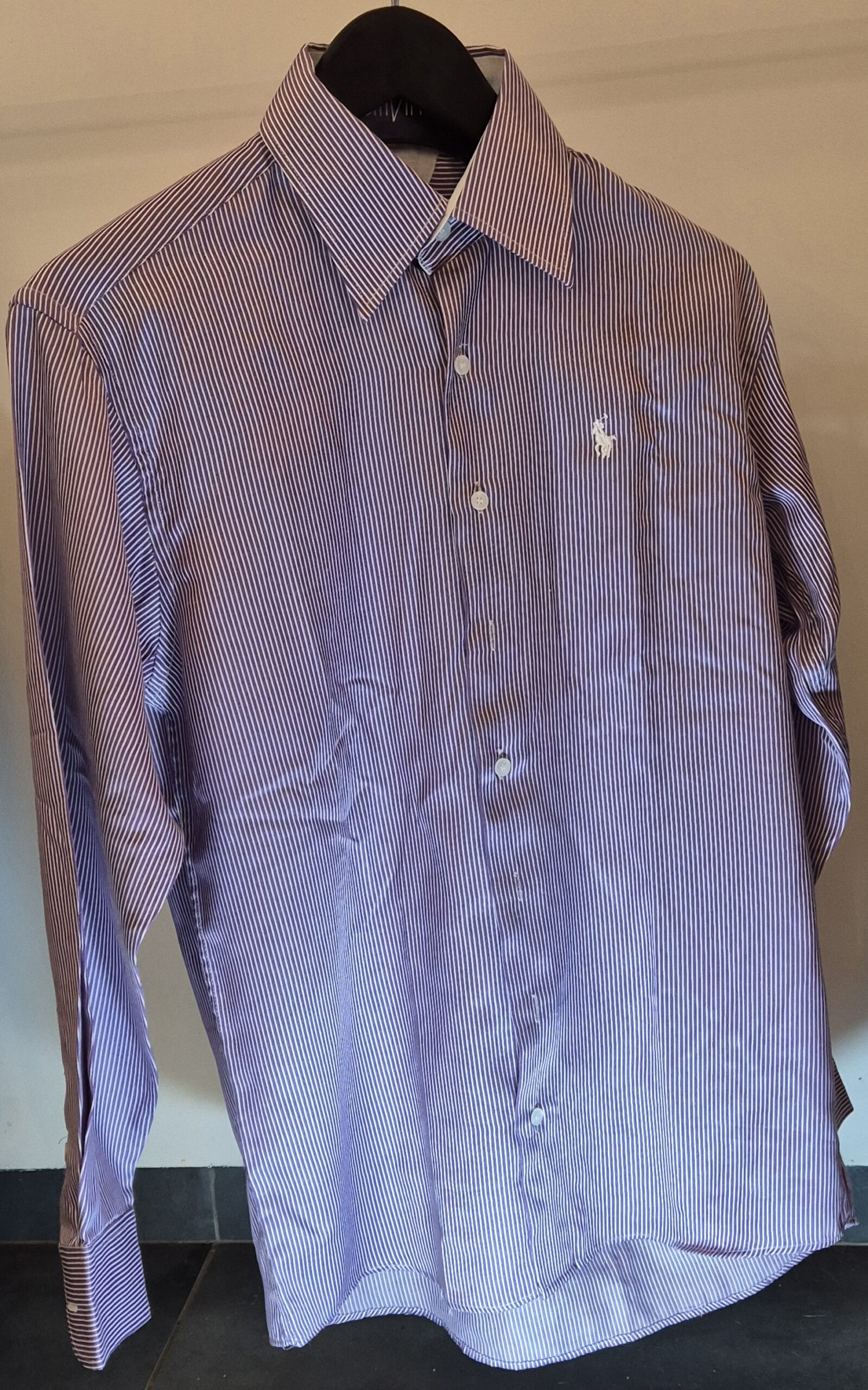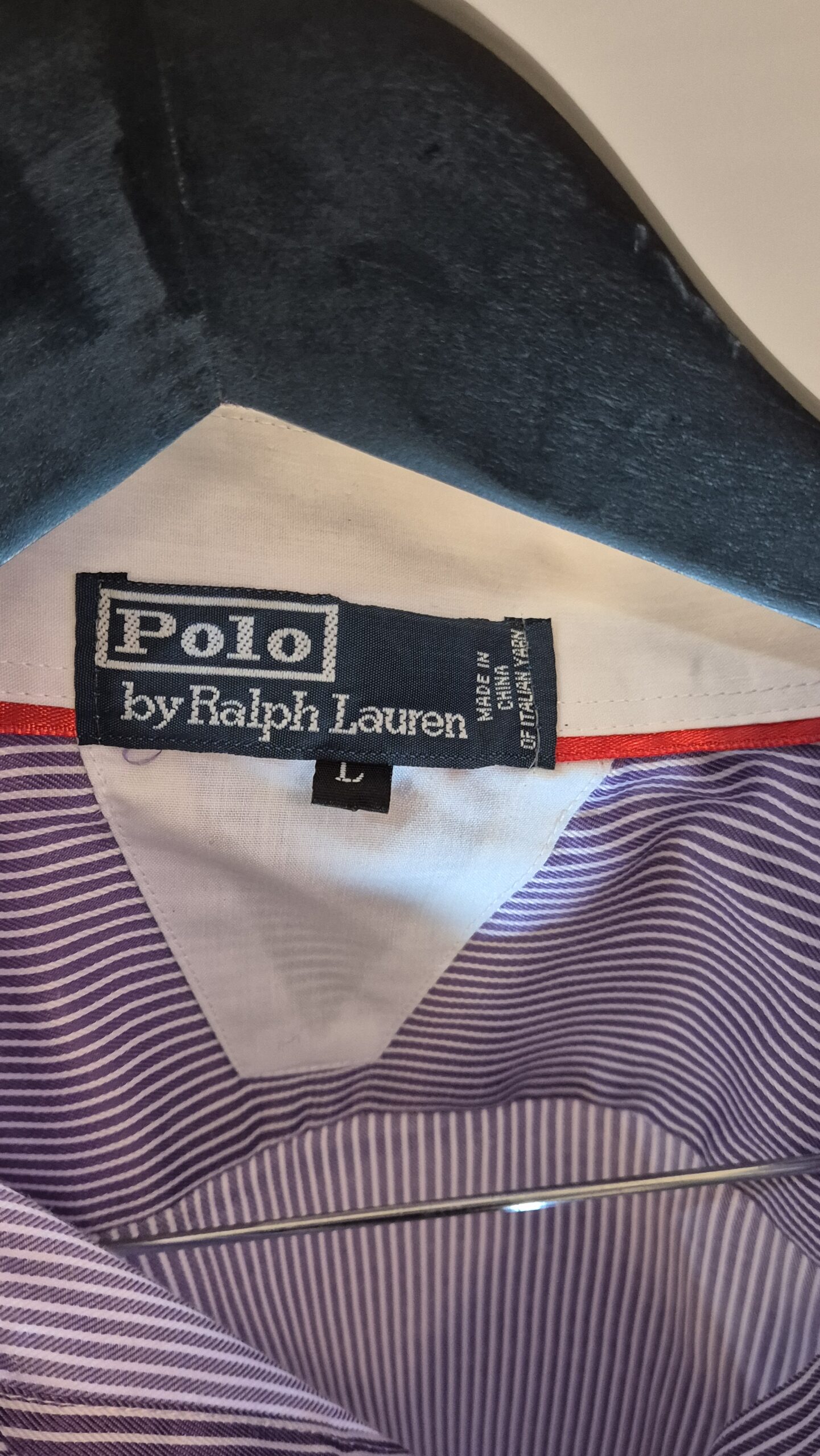 חולצה מכופתרת, שרוול ארוך, פסים סגול (עבים) ולבן (דקים), קלסית, של פולו ראלף לורן, מידה L, ללא כל פגמים, קרעים, כתמים וכו’.
