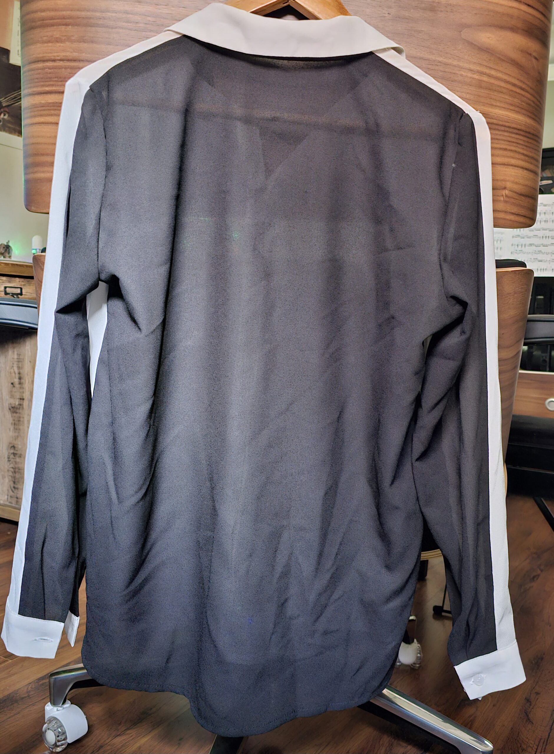 לבנה מקדימה, שחורה מאחורה, בד 100% פוליאסטר טיפה שקוף, כפתורים מגיעים עד הצווארון, חולצה מעוד כלילה ונוחה, נלבשה פעמים ספורות.