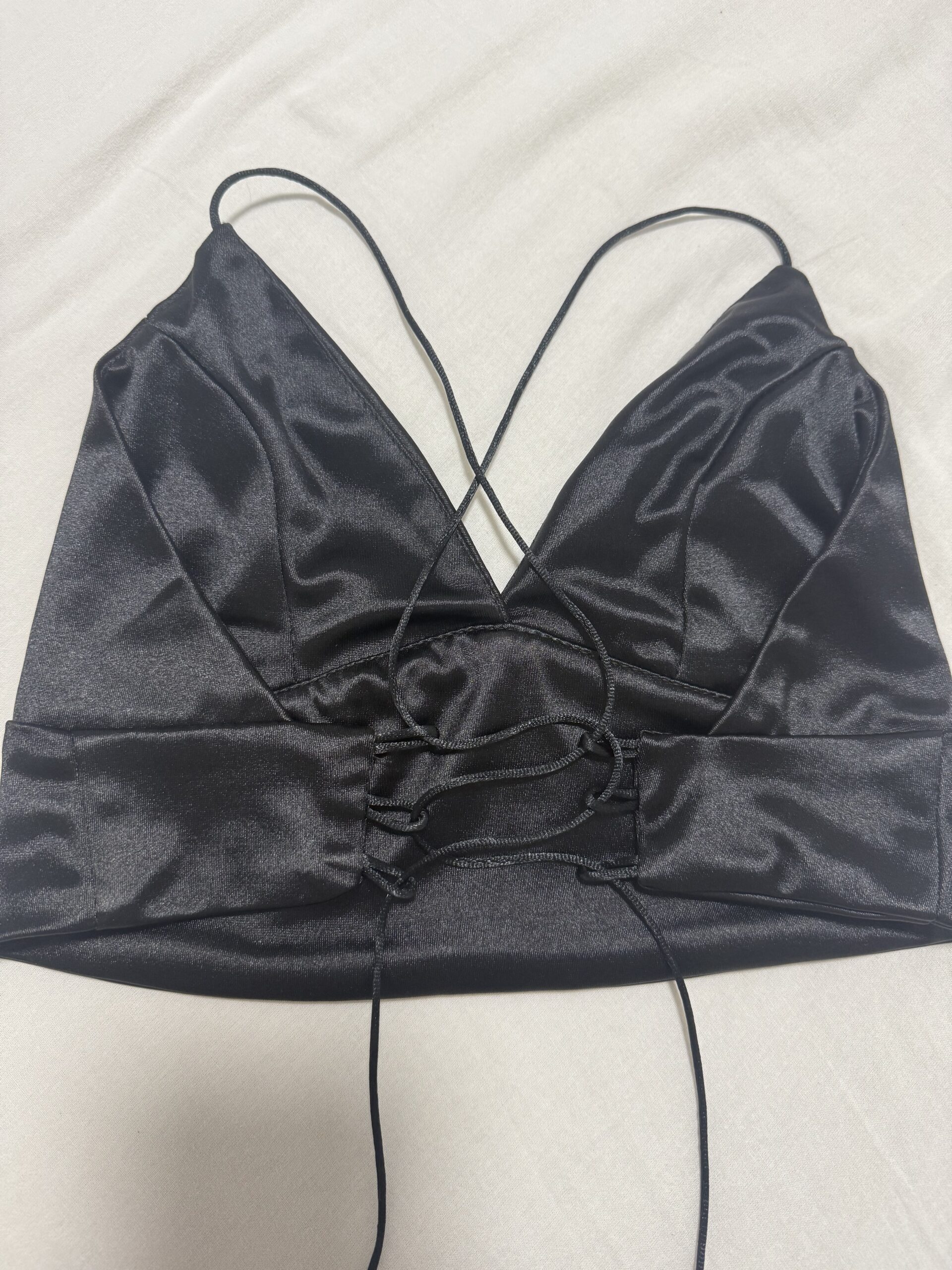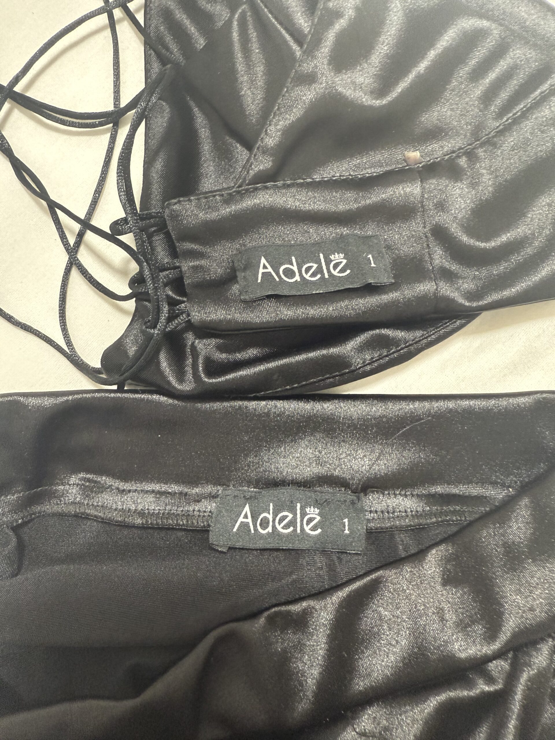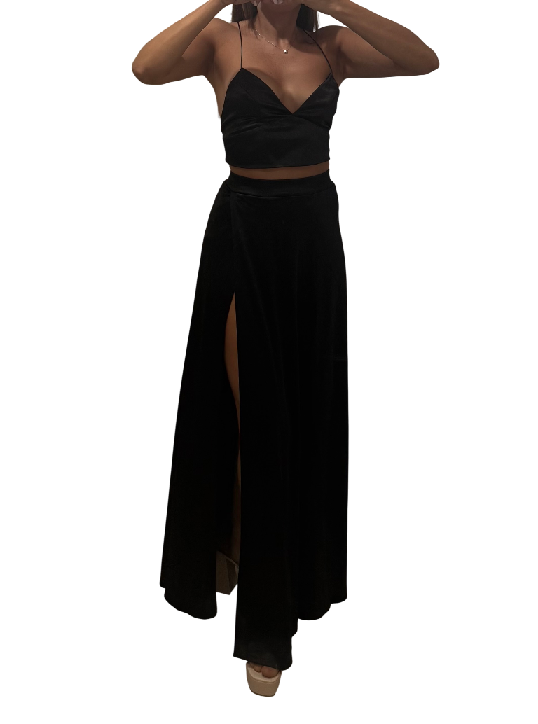 שמלת ערב בד משי סאטן 2 חלקים (חצאית מקסי עם שסע וטופ עם חוטי קשירה בגב