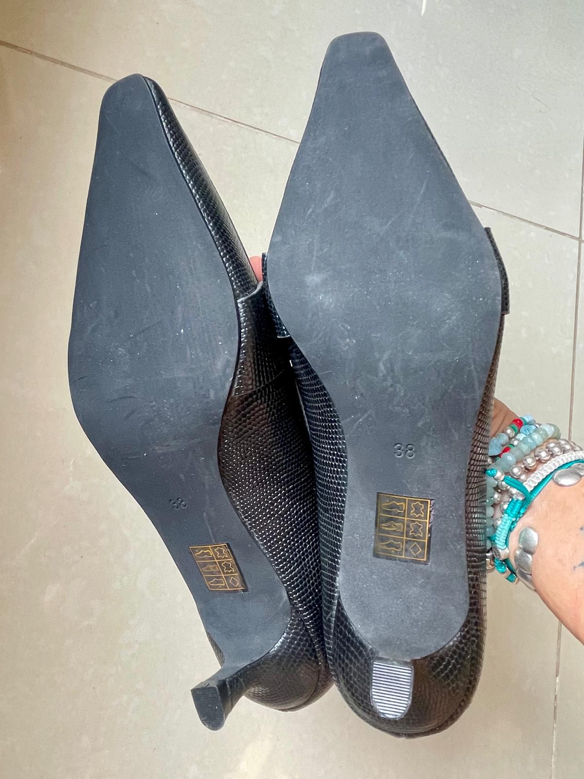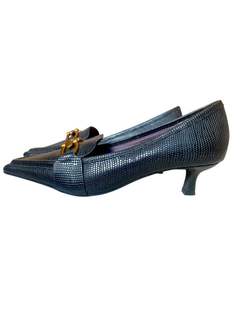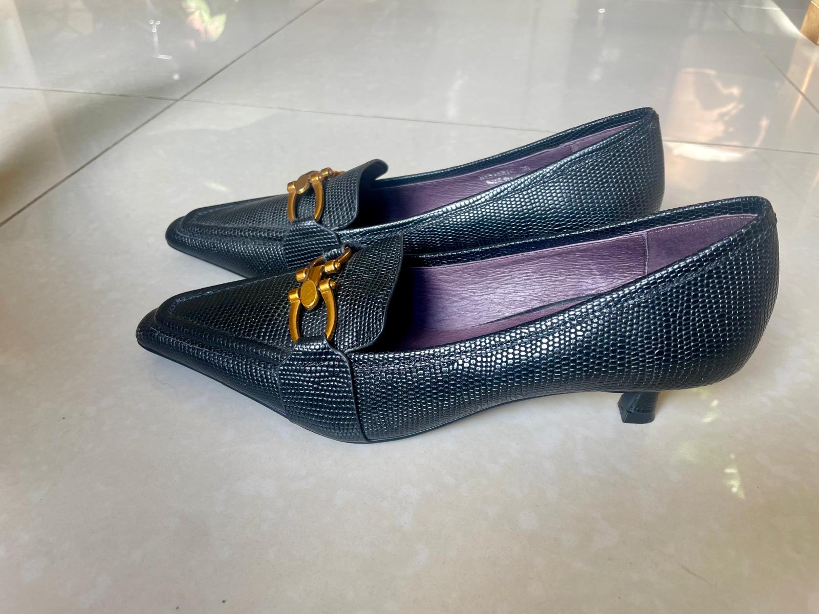נעלי סירה בצבע כחול מאוד כהה, עם עקב בגובה 4 ס”מ ואבזם לקישוט. חדשות, לא ננעלו מעולם, מגיעות ללא הקופסה.