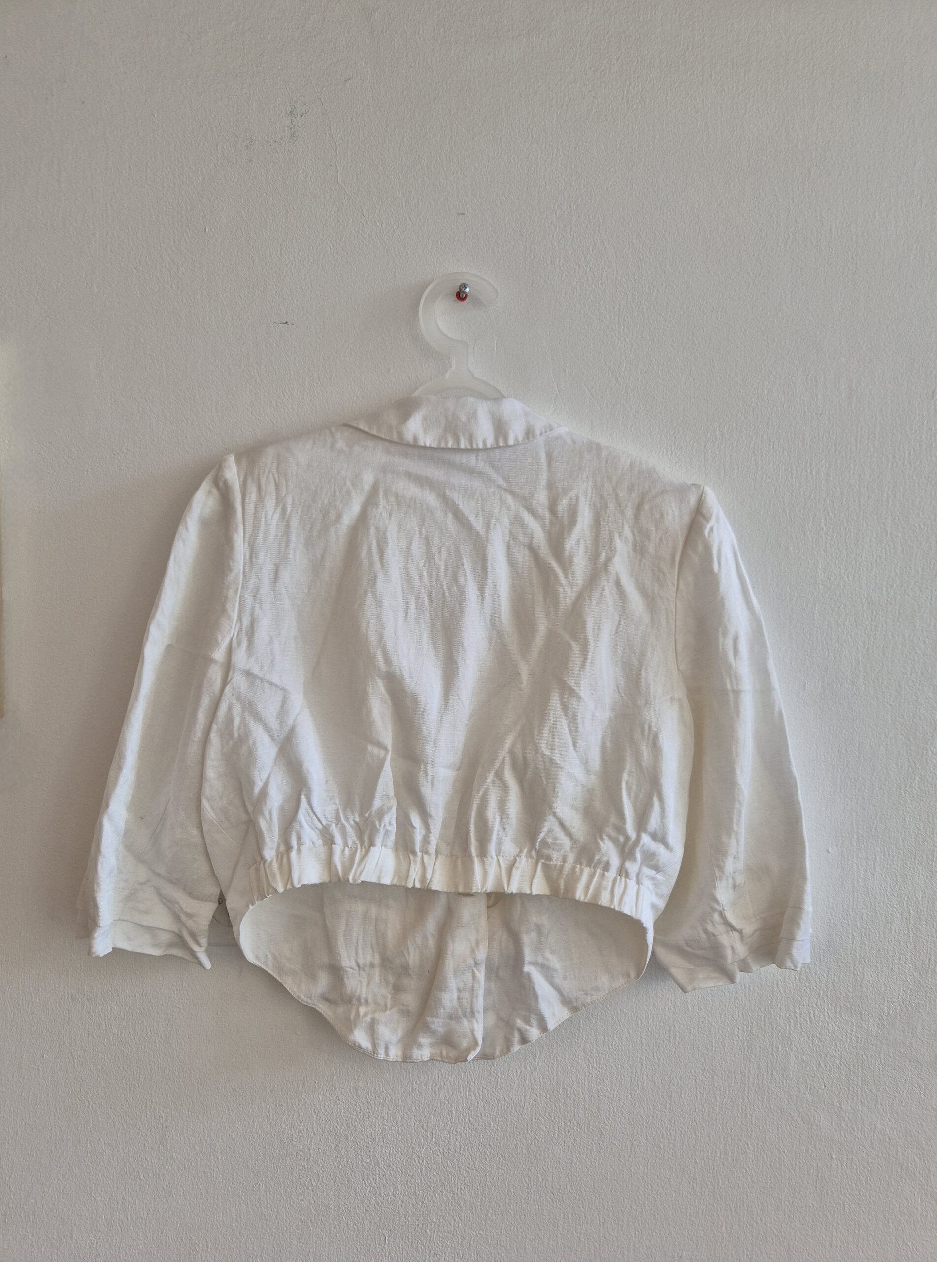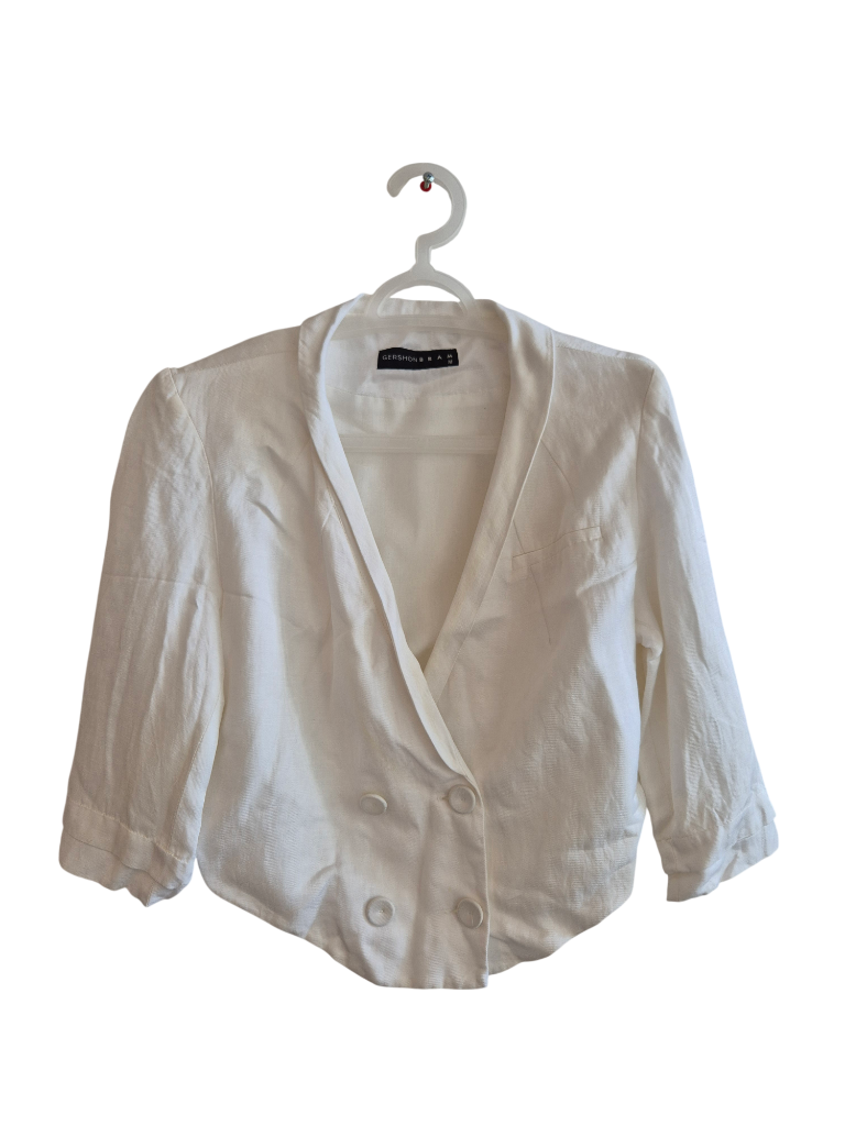 ג’קט לבן של המעצב גרשון ברם, עם גזרה גבוהה וכריות כתפיים.