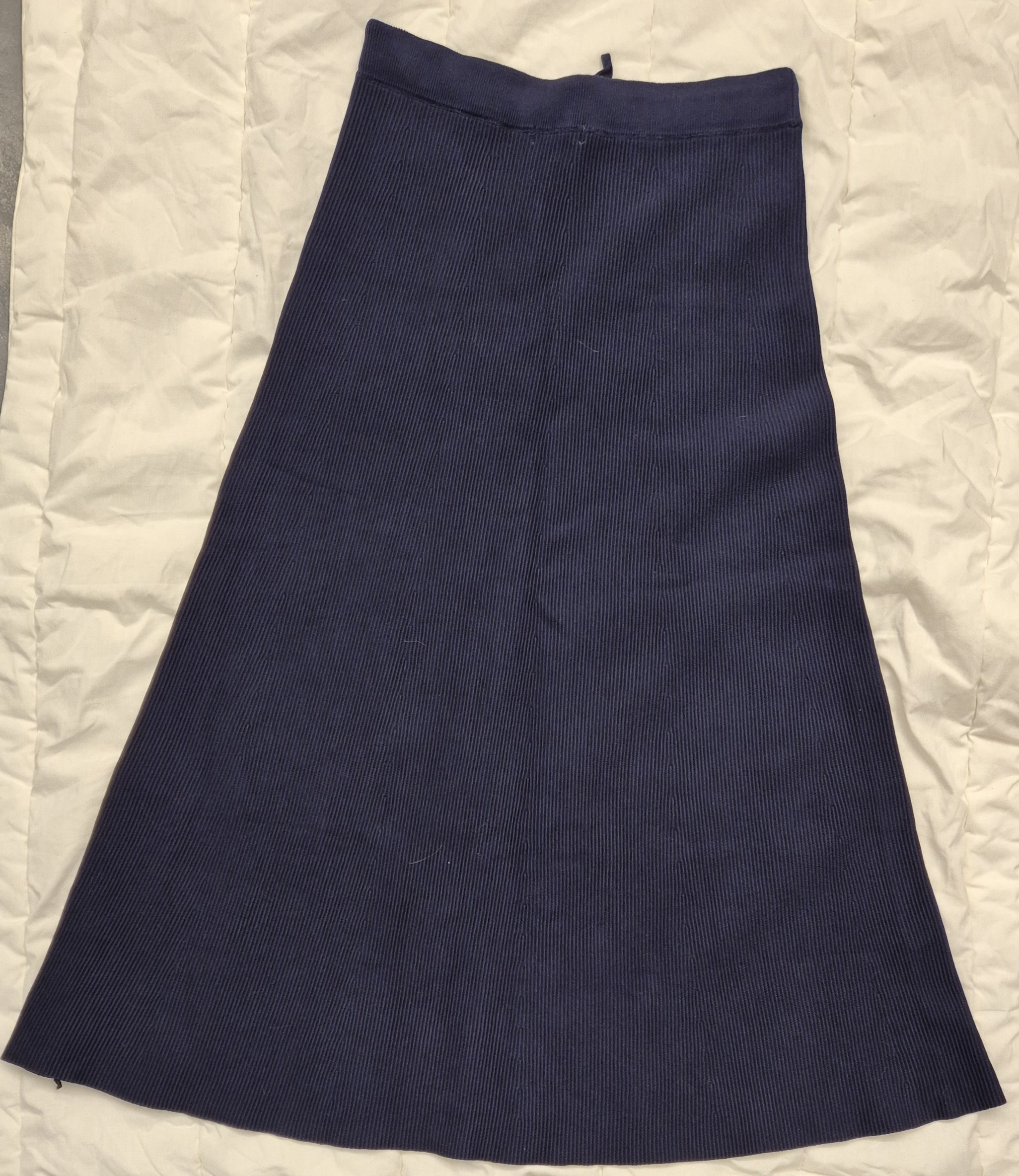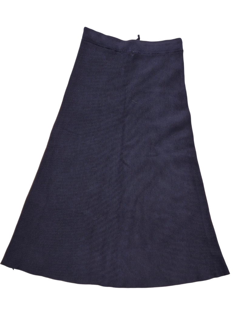 חצאית מקסי סרוגה, כחולה כהה (navy), בד עבה וחם לחורף ולמרות שסינטטי בעל מרקם מדהים וממש נעים למגע, הרכב בד: 72 אחוז ויסקוזה, 28 אחוז פוליאסטר, חדש עם תוית ולא נלבש מעולם.