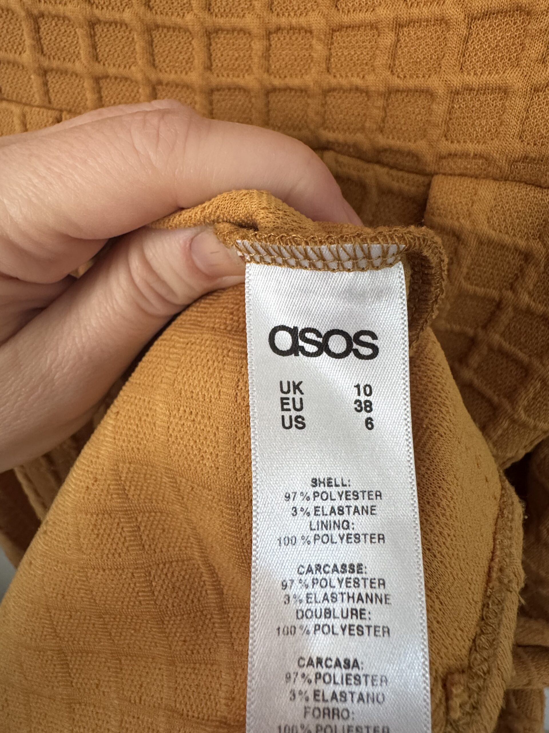 שמלת מידי בצבע חרדל של אסוס בגזרה מחמיאה, רוכסן בגב, בטנה בחלק העליון.
