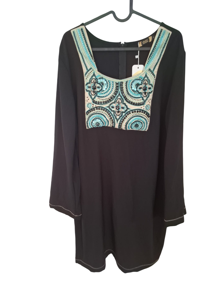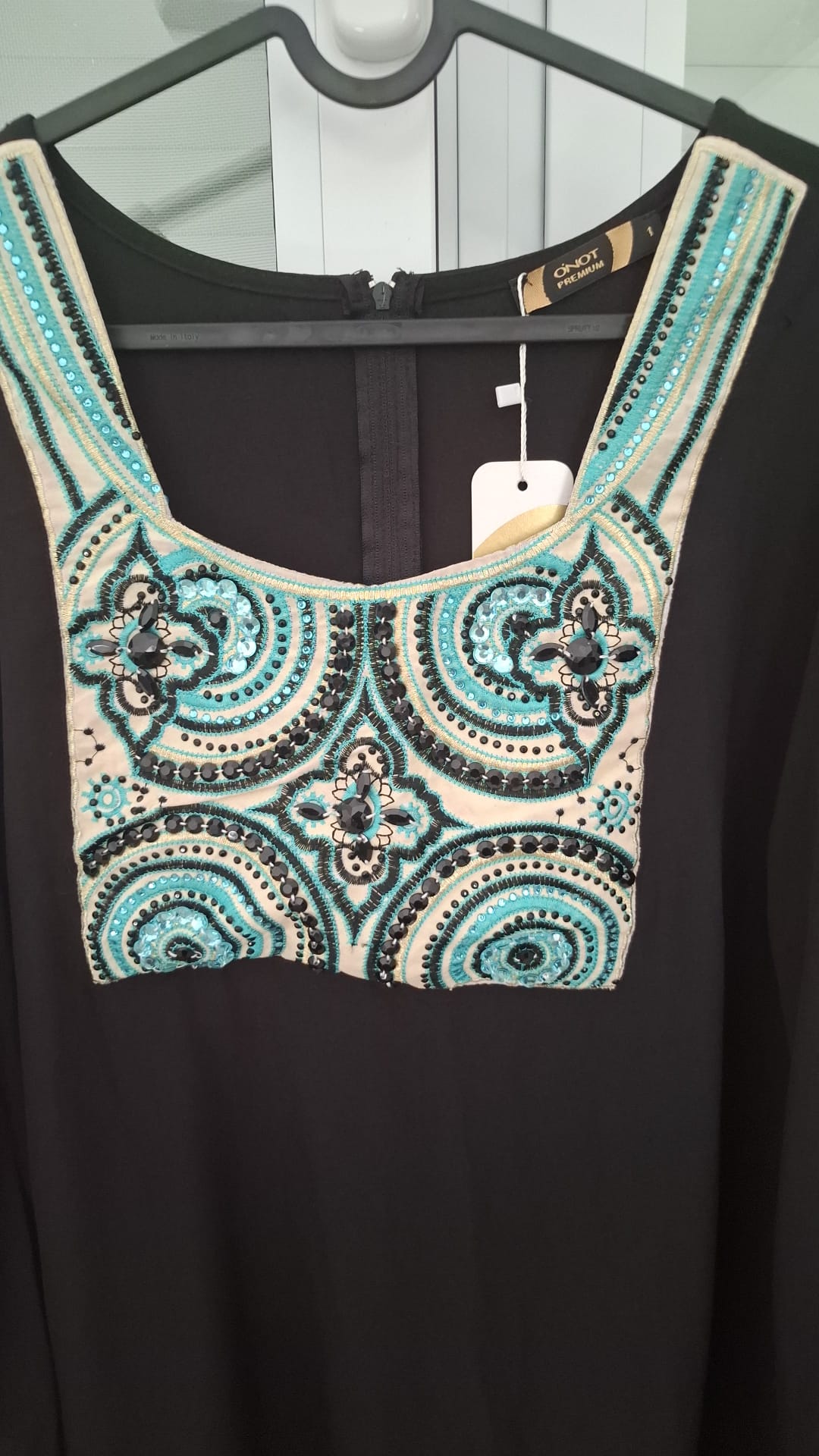 שמלת ערב שחורה אתנית. פייטים ואבנים רקומים בצבעי שחור ותכלת על רקע קרם.