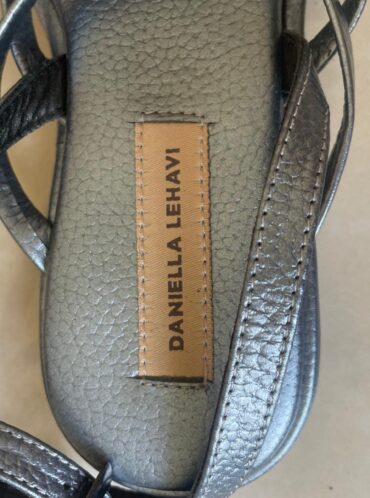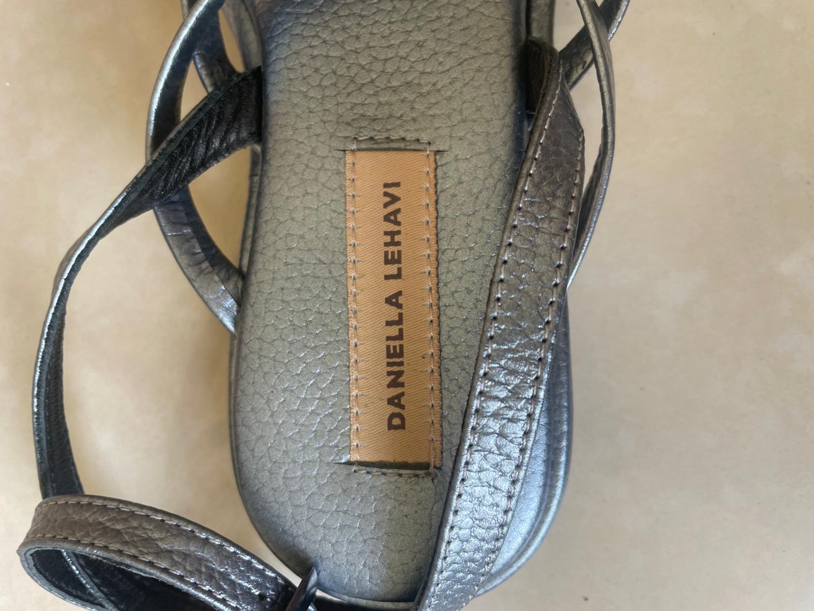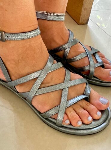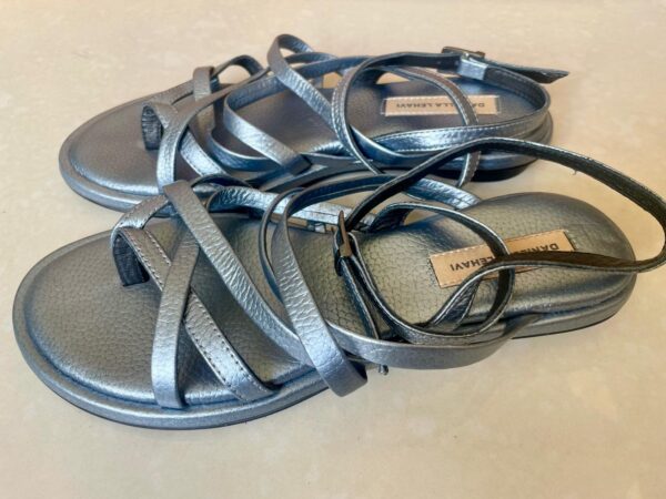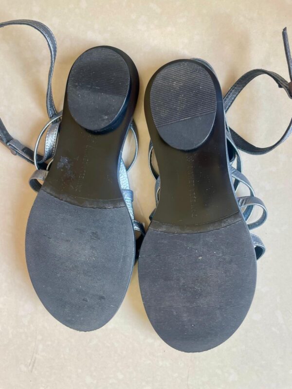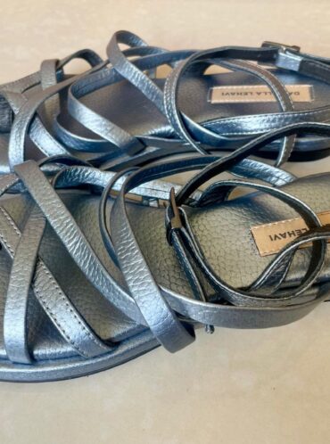 סנדלים שטוחות עם רצועות עור דקות בצבע כחול אפרפר מטאלי. ננעלו פעם אחת בלבד.