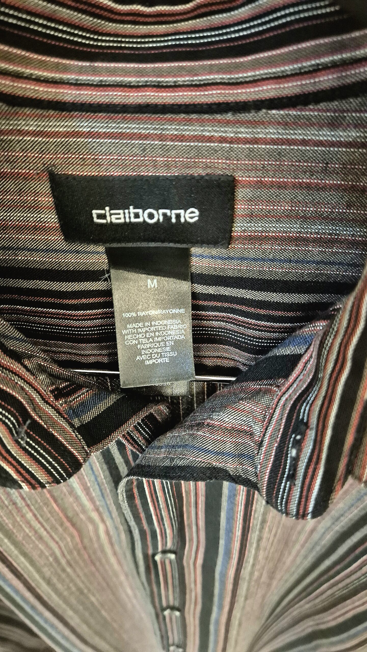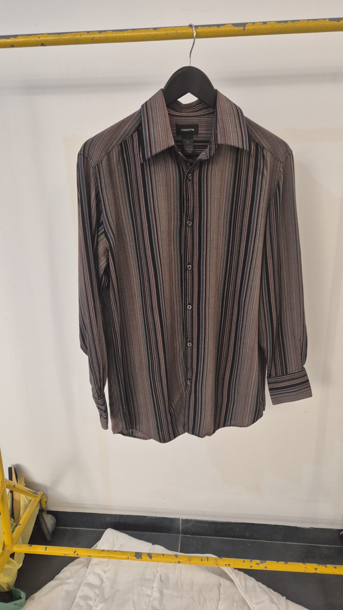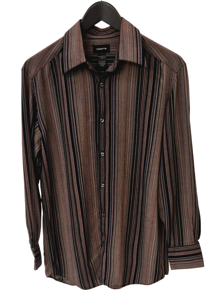 חולצה מכופתרת ארוכה כהה ומפוספסת M של Claiborne, ללא כתמים, קרעים או פגם כלשהו.