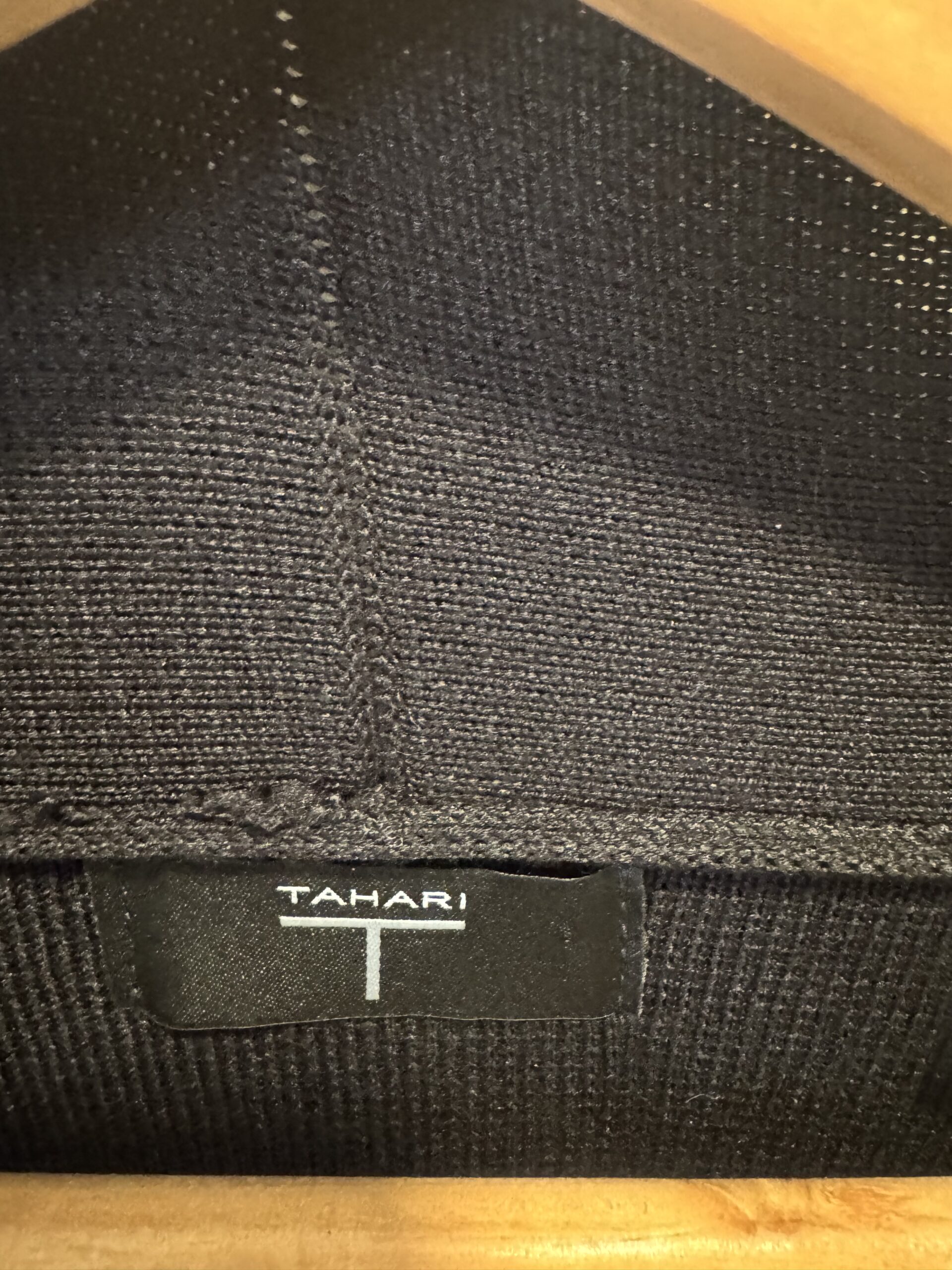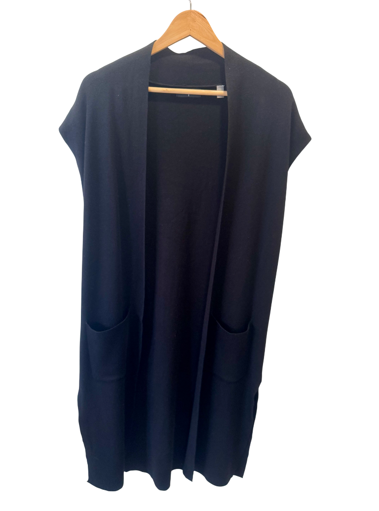 קרדיגן שחור ארוך בגזרה נקייה, ללא סגירה, עם כיסים קדמיים. בד רך ונשפך, קל לשילוב מעל כל לוק. חדש לעולם לא נלבש