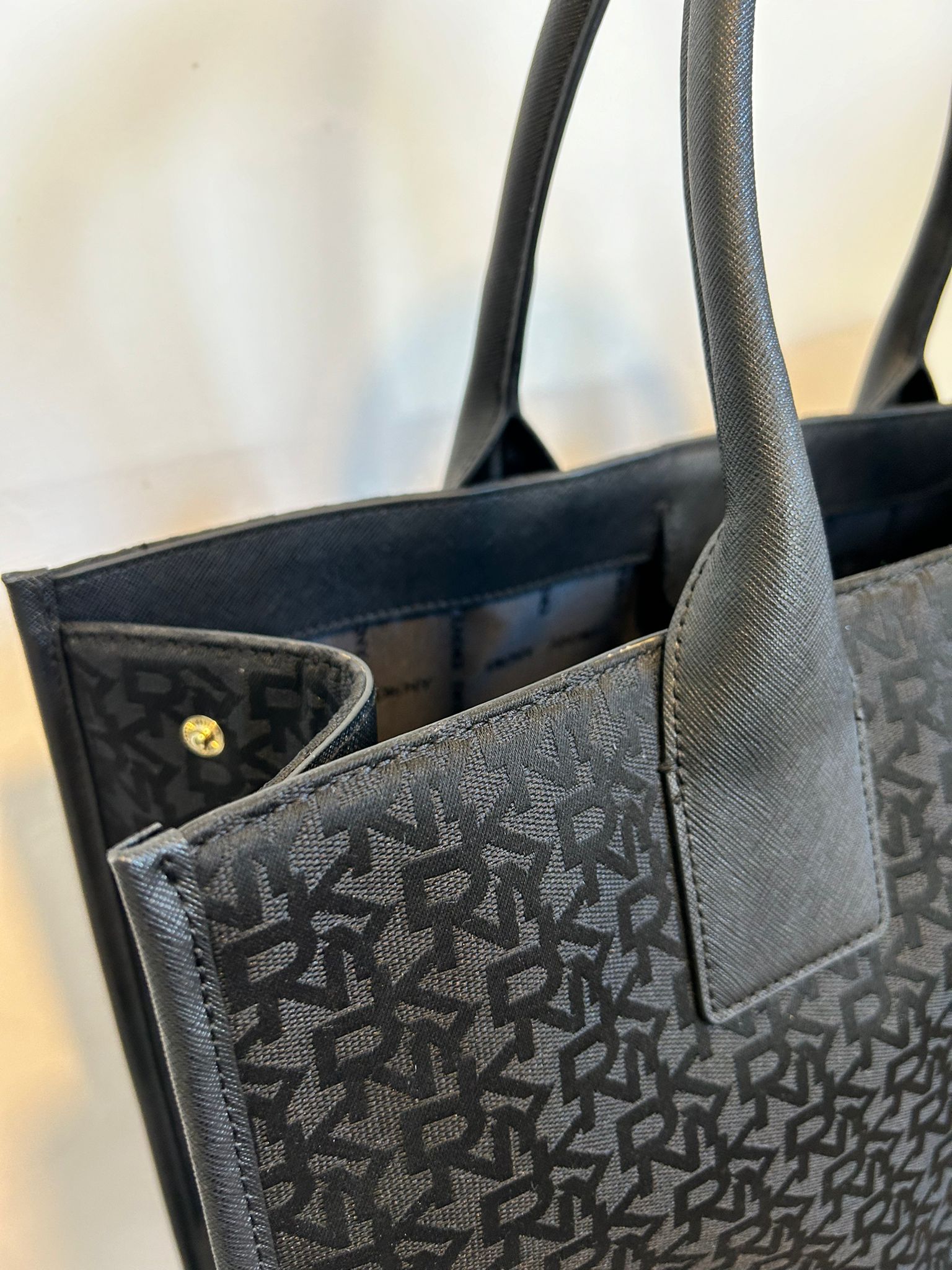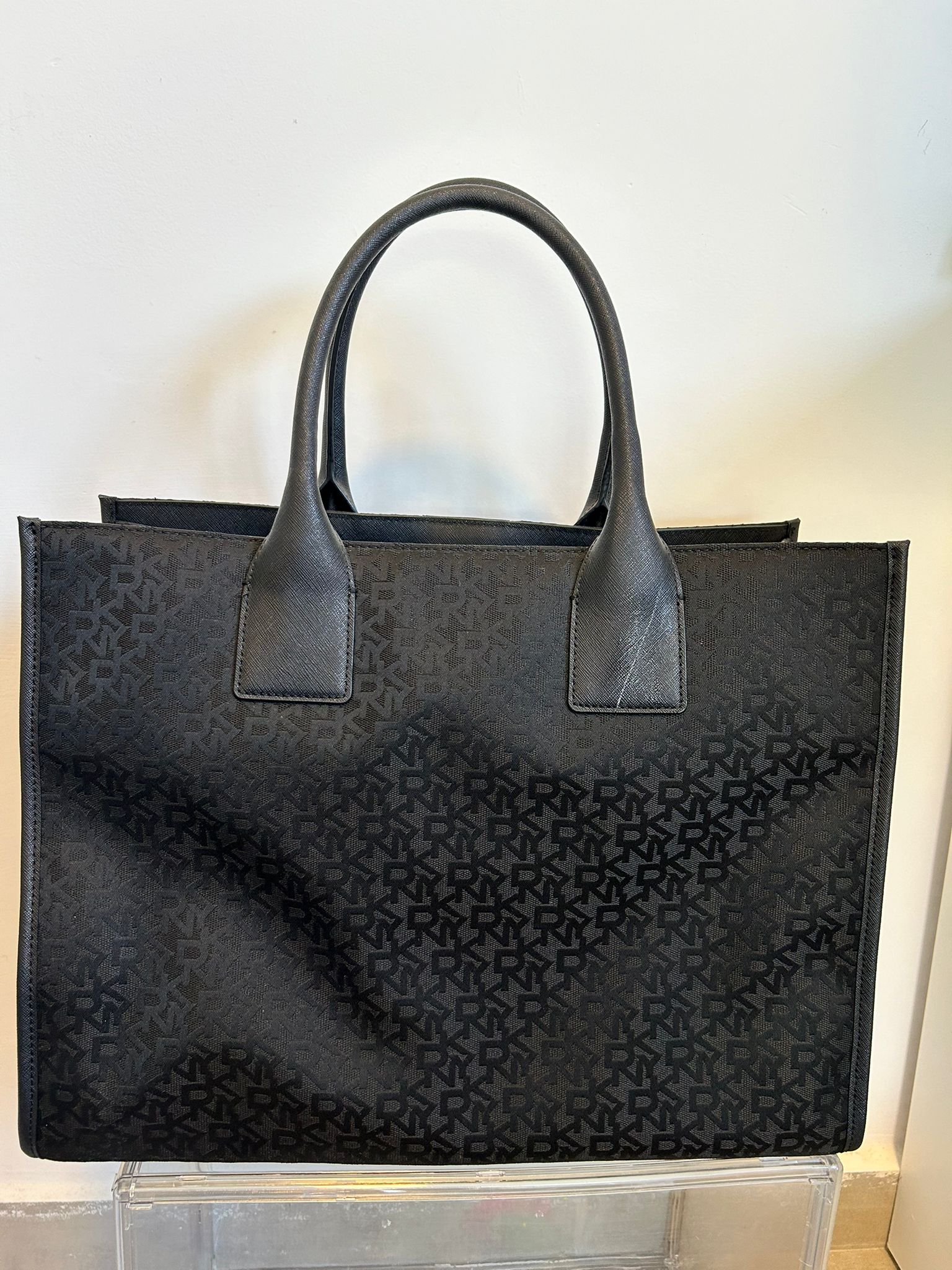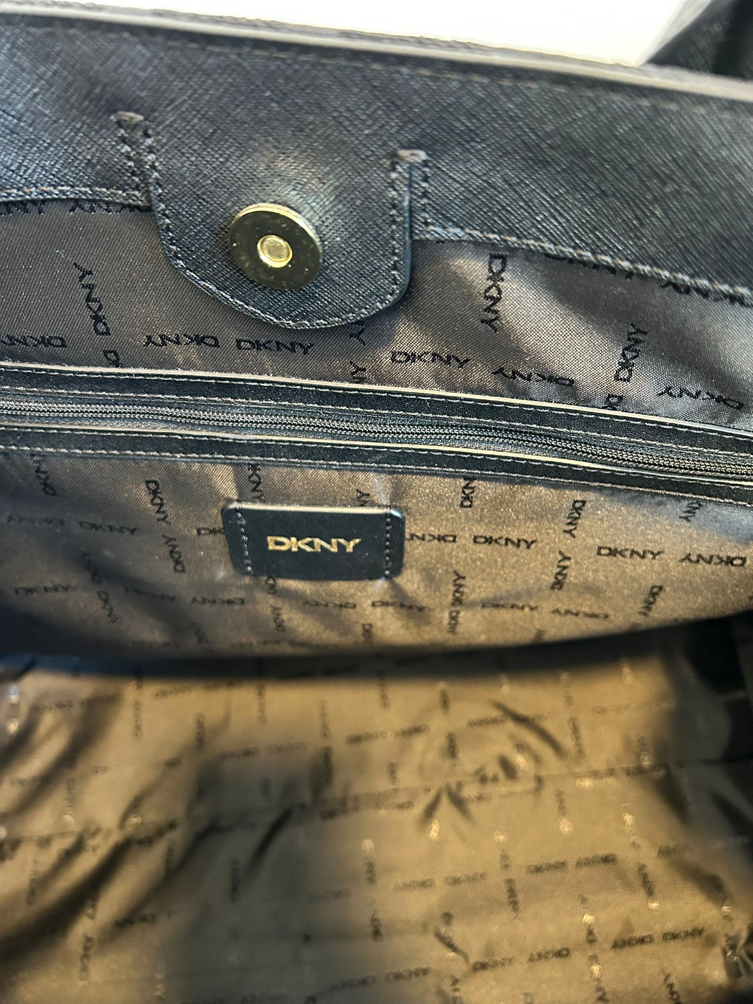 תיק גדול עם לוגו של DKNY בצבע כחול ים. היה בשימוש פעם אחת בלבד, כמו חדש. סגירת כפתור בצדדים ובפנים. ללא רוכסן, ללא רצועה ארוכה.