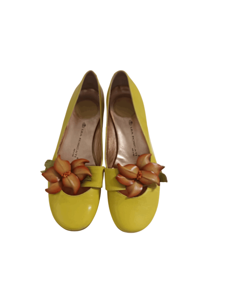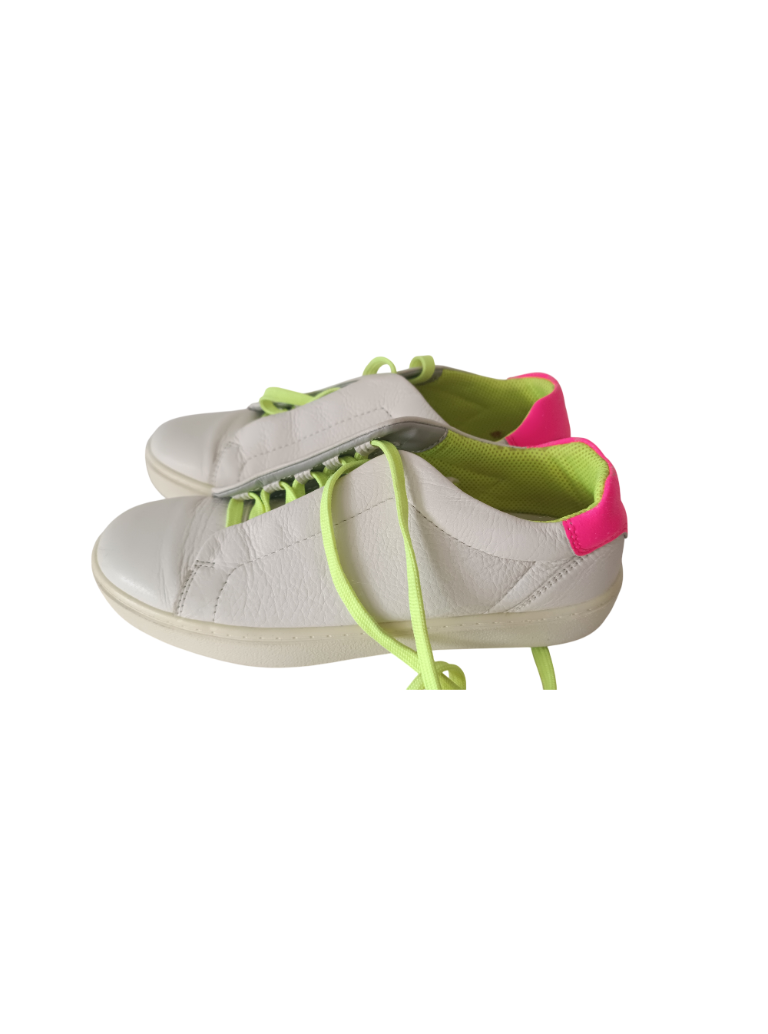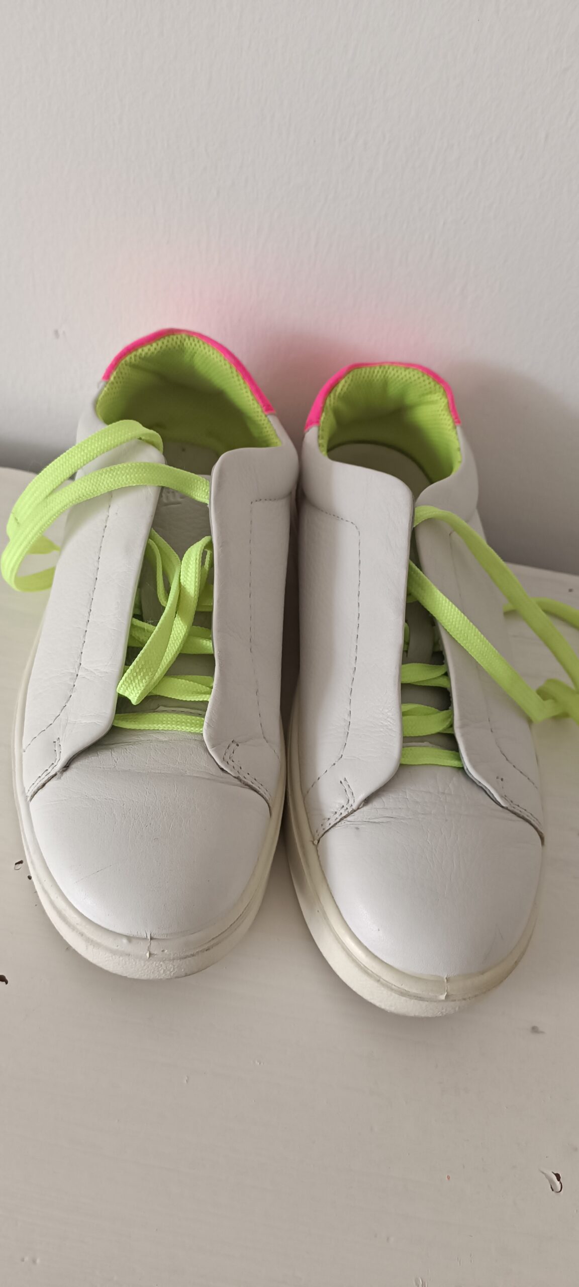 נעלי סניקרס עור מידה 37 עם שרוכים ירוקים וחלק של עקב בצבע ורוד.