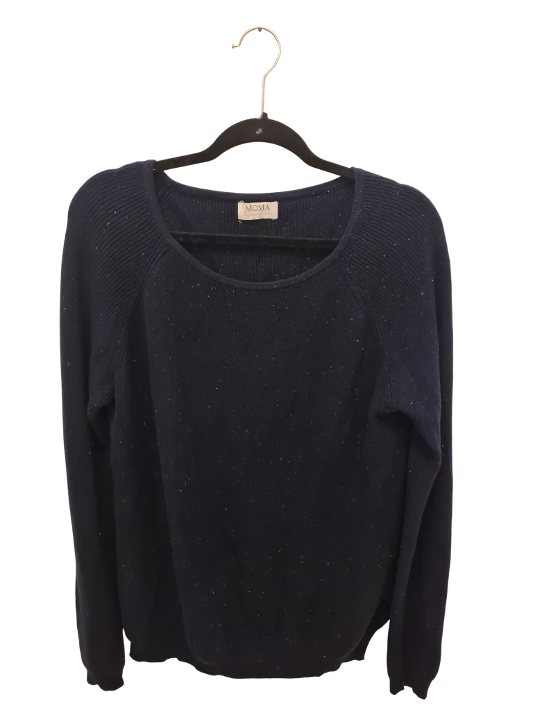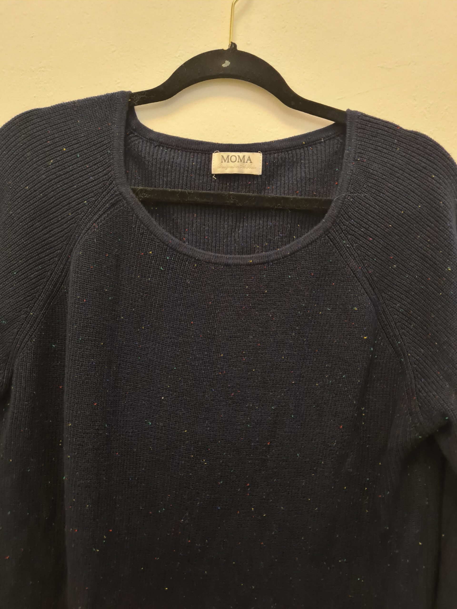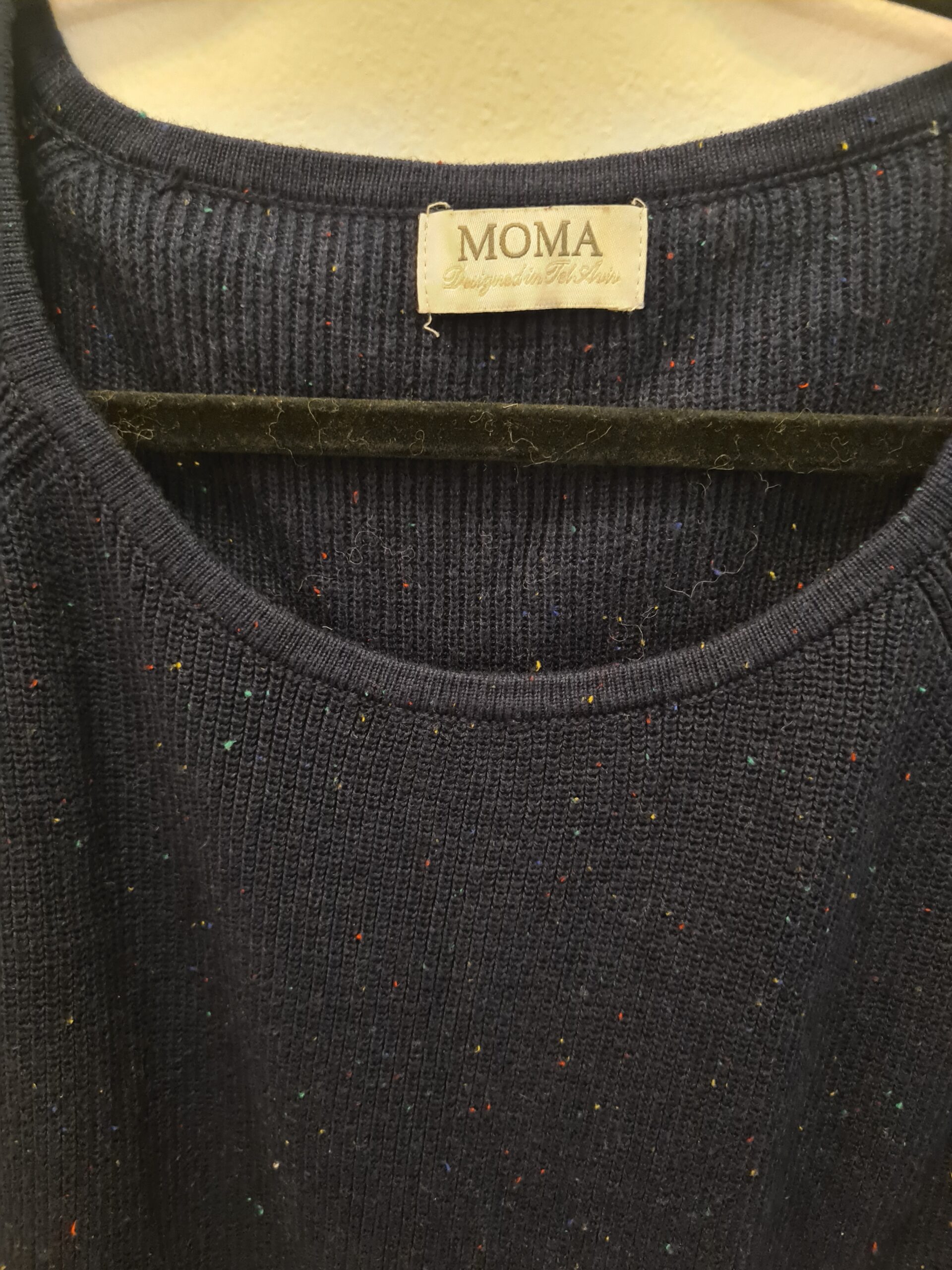 סוודר של moma tlv בצבע כחול עם נקודות קטנטנות צבעוניות. מידה ואן סייז אבל גדול יחסית. נלבש פעמיים בלבד!