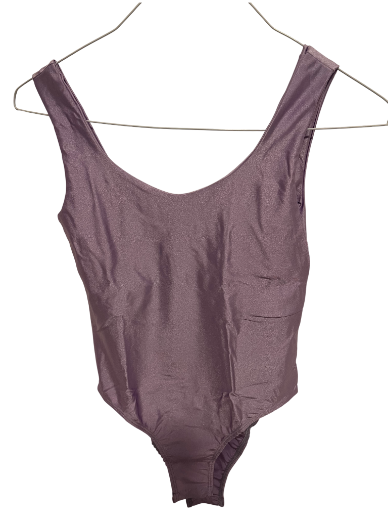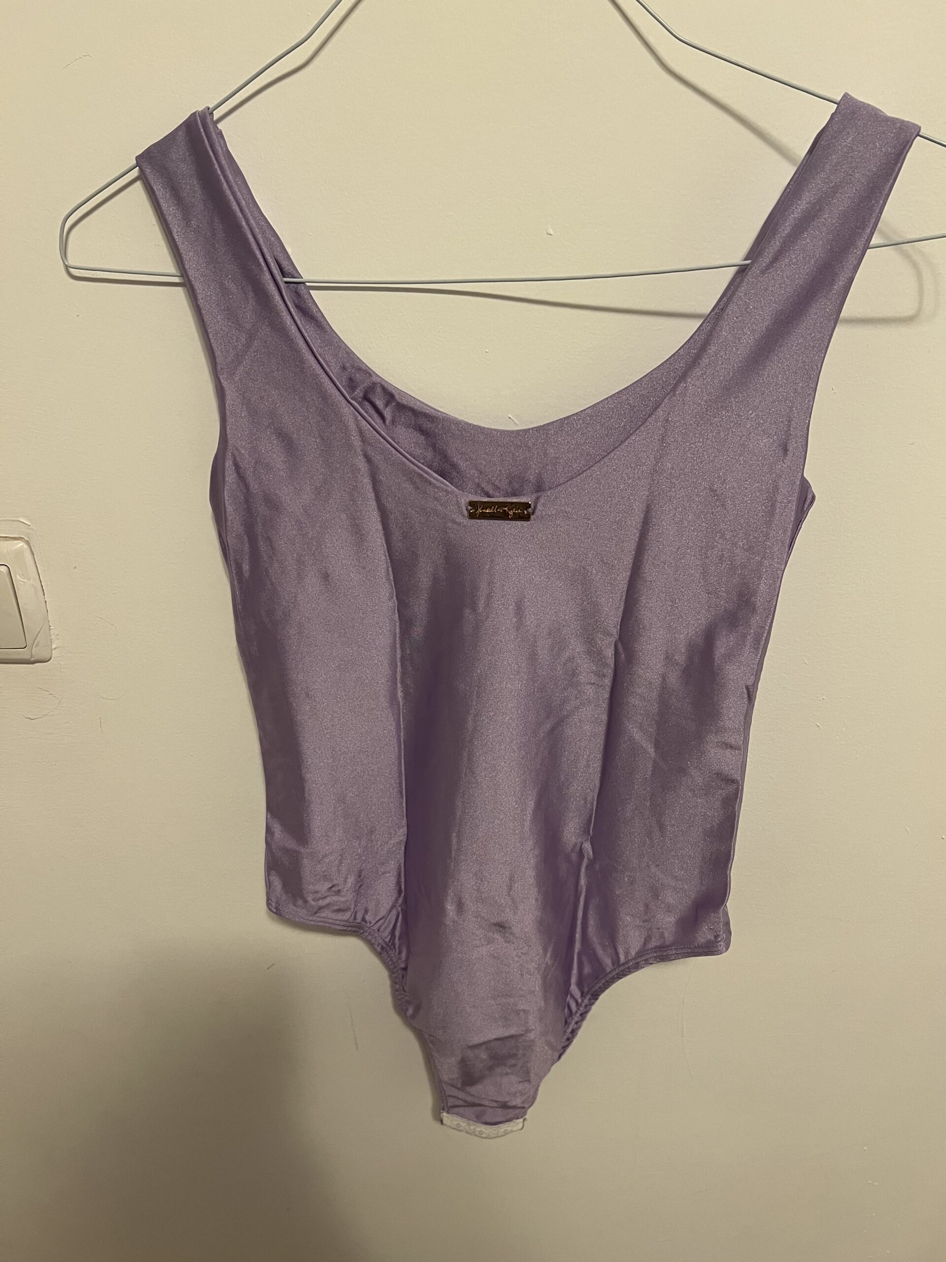 בגד גוף בצבע סגול בהיר מבריק מעט, מידה s. מפתח עגול, מעט פתוח בגב. לא נלבש בכלל!