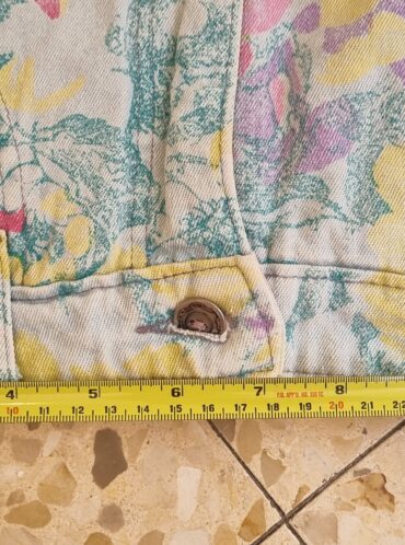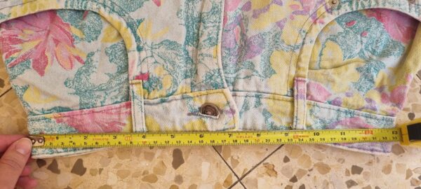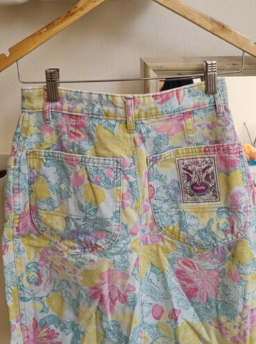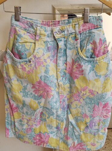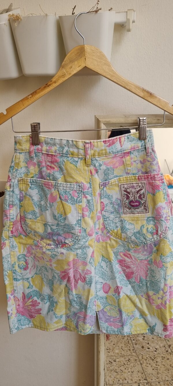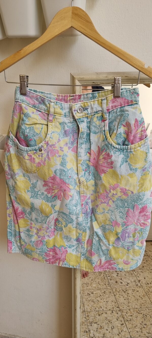 חצאית וינטג היסטרית! נרכשה בלונדון ולא נלבשה. יש לה רוכסן וכפתור מקדימה. 2 כיסים מקדימה ו2 מאחורה. הבד הוא ג’ינס וההדפס בצבעי פסטל מגניבים. שווה ממש!